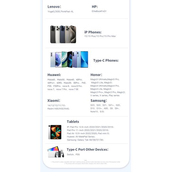 | Applicable to | Smartphones, Tablets, Laptops, Power Banks, Portable Speakers, Cameras, Gaming Consoles, External SSDs and Hard Drives, Monitors and Displays, Other Electronics |